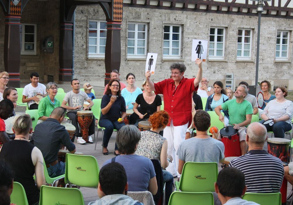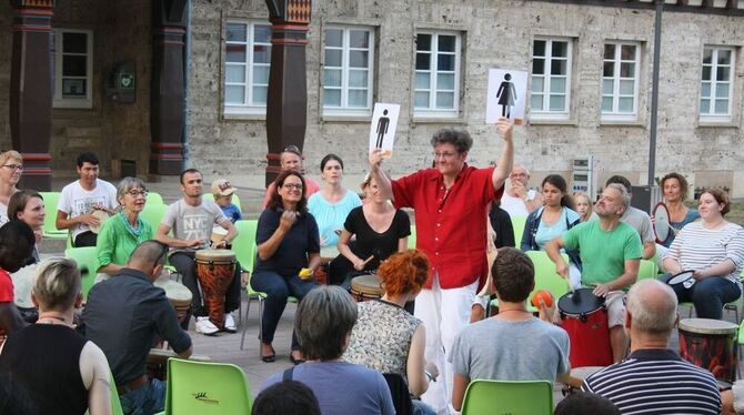 Und jetzt die Frauen: Ricarda Raabe, die Rhythmus-Meisterin, dirigiert das Trommel-Orchester vor dem Münsinger Rathaus. FOTO: MKÖ