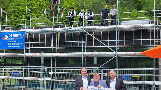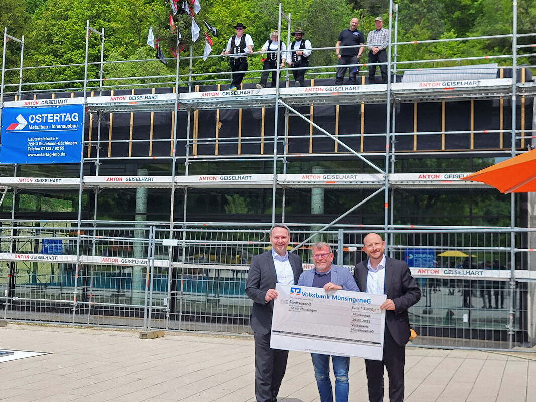 »Vor vier Jahren haben wir Kultur in dieses Freibad hineingebracht, das soll nun mit dem Hallenbad Fortsetzung finden«. 74 000 Euro Spenden wurden bis zum Richtfest gezählt, für Münzing ein Zeichen, dass die Identifikation mit den Bädern in Münsingen groß ist. Zum Fest überreichte die Volksbank einen Scheck mit weiteren 5 000 Euro und auch Jürgen Krohmer von Holzbau Krohmer, der den Richtspruch hielt, legte noch 2 000 Euro drauf. (in)