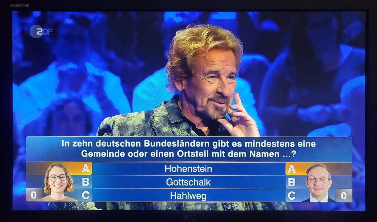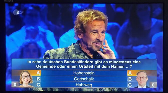 Sowohl Kandidatin Eva Herrmann als auch Wigald Boning, die gegeneinander antraten, hatten die richtige Antwort parat: Hohenstein. Thomas Gottschalk hatte eingeräumt, die Antwort nicht zu wissen, und meinte: »Es gibt hoffentlich bald eine Straße, die nach mir benannt wird.« In seinen Augen wäre das wohl das Mindeste an Ehren, die er verdient hätte. Müller-Hohenstein wusste indes, dass es ein Hohenstein in Oberfranken (Bayern) direkt an der Autobahn 9 Nürnberg – Berlin gibt. (GEA)