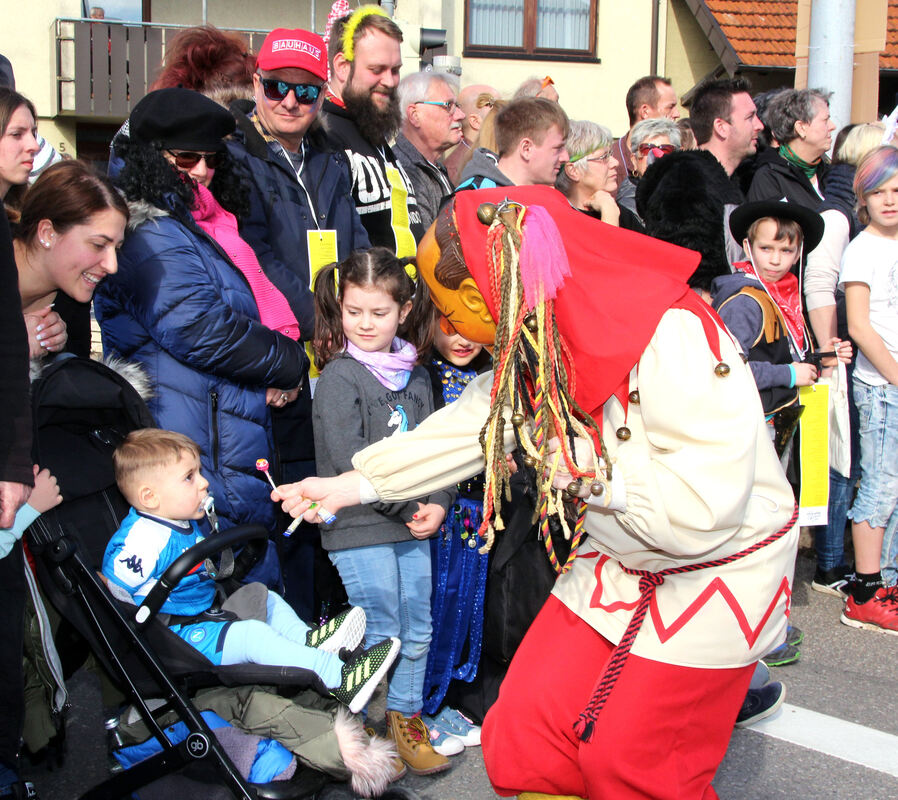Auch bahnten sich beeindruckende Fasnachtswagen ihren Weg durch die dicht gedrängten Zuschauerreihen. Die Stimmung der Hästräger war prächtig und übertrug sich auch auf die Zuschauer, die gerne mitsangen oder am Straßenrand schunkelten. Allerdings liefen die Begegnungen nicht ohne so manchen Schabernack ab. Narren »kidnappten« junge Mädchen, trugen sie auf den Schultern umher, badeten sie in einer riesigen Konfettiwanne oder drückten Narrenstempel auf Glatze, Stirn und Bauch. Gerne wurde Mützen geklaut, Schuhbändel verknotet oder bunte Farben ins Gesicht geschmiert. Als Entschädigung bauten die Maskenträger tolle Menschenpyramiden, flogen die Hexen mit ihren Besen durch die Reihen – oder wie die Trochtelfinger sogar durch die Luft. Zur Freude der jüngsten Fasnetsnarren wurden wieder großzügig Süßigkeiten verteilt. Im Anschluss feierten Narren und Zuschauer lange weiter. (GEA)