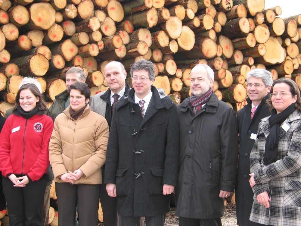 Über das Projekt »Holz der kurzen Wege« freuen sich (von links): Schwörer-Praktikantin Jasmin Schrodi, Dr. Dietmar Götze vom Bundesforstbetrieb Heuberg, Umweltministerin Tanja Gönner, der Landtagsabgeordnete Karl-Wilhelm Röhm, Geschäftsführer Johannes Schwörer, Landrat Thomas Reumann, Bürgermeister Jochen Zeller und Petra Bernert, die Leiterin der Biosphärengebietsverwaltung.
