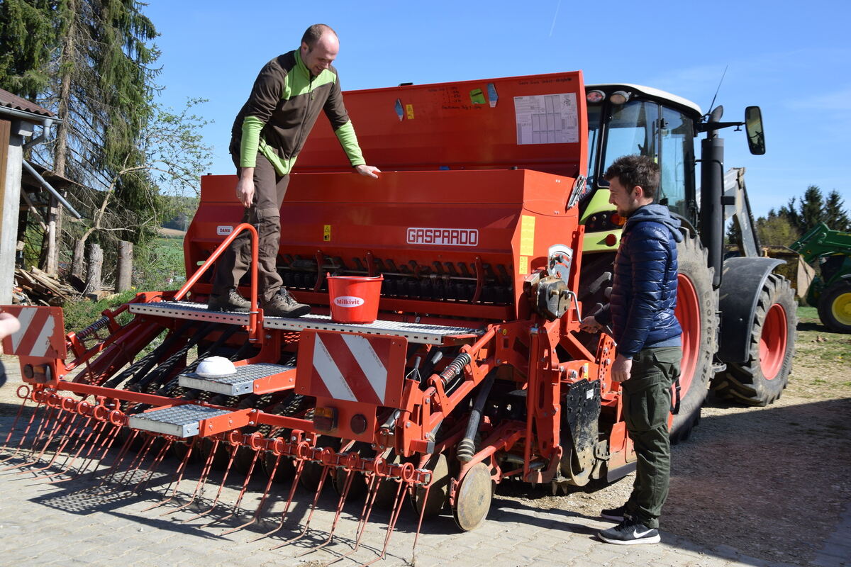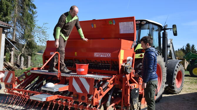 Beim Abdrehen, dem Einstellen, der Sämaschine: Thomas Pfeifle am Saatgutbehälter und Azubi Pierre Rebstock (rechts). FOTOS: GEIGER