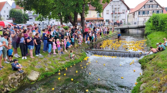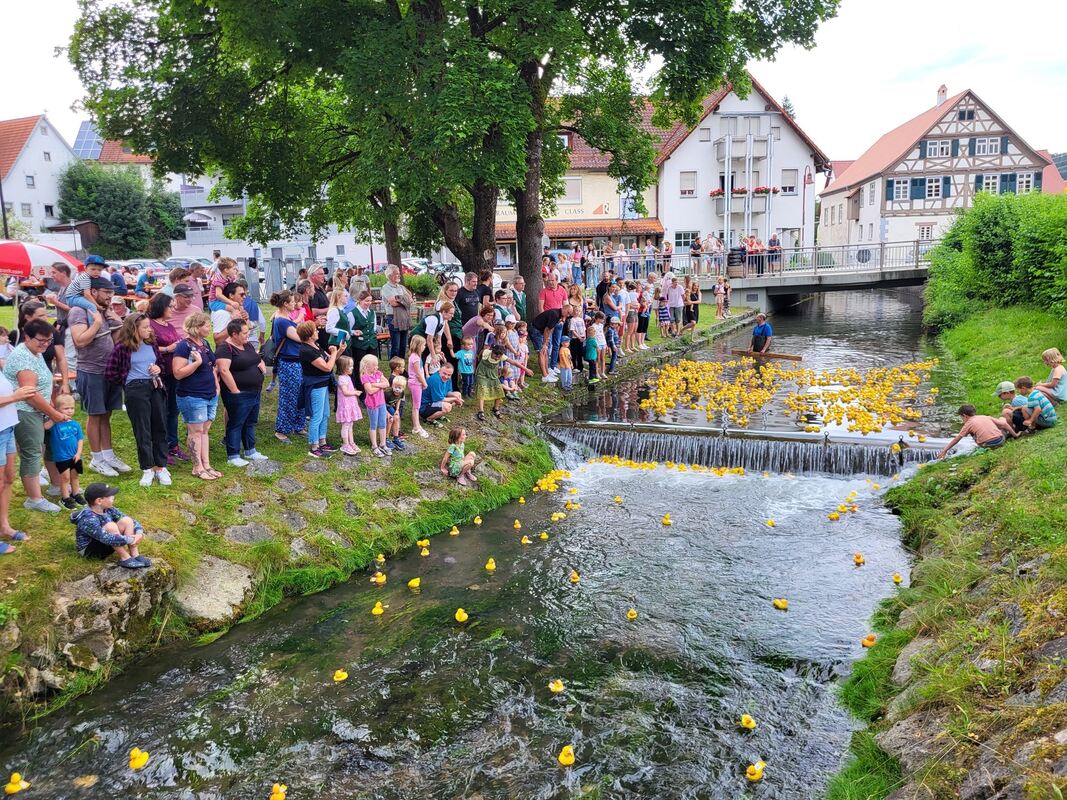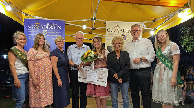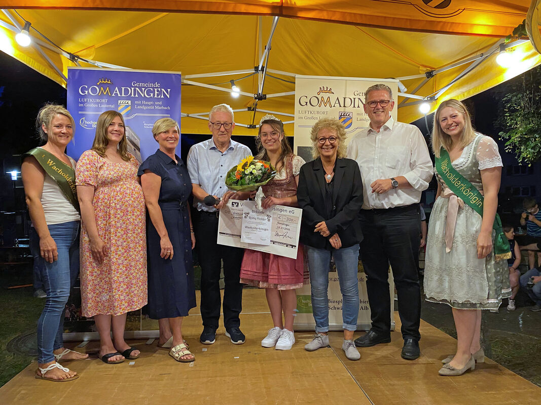 Krönung der neuen Wacholderkönigin: Von links: Maike Leuze, Lisa Class, Cindy Holmberg, Bürgermeister Klemens Betz, Romy Holder, Beate Müller-Gemmeke, Michael Donth, Anja Winter.