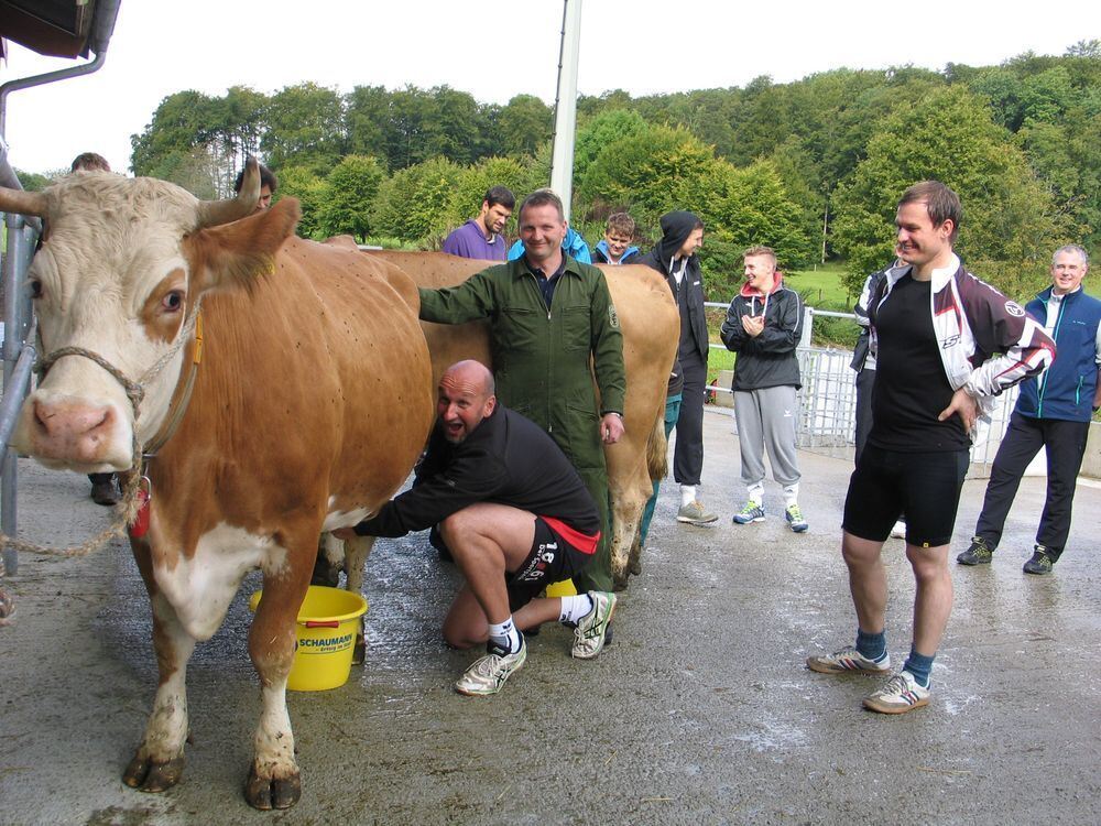 »Wally« hält still, während Trainer Hans-Peter Müller-Angstenberger sie melkt, Vollzugsbeamter Achim Geiselhart sie tätschelt und Spitzenkoch Simon Tress im Sportdress ebenso dabei zuschaut, wie es die Volleyballer tun, bevor auch sie mit Melken dran sind. GEA-FOTO: OELKUCH