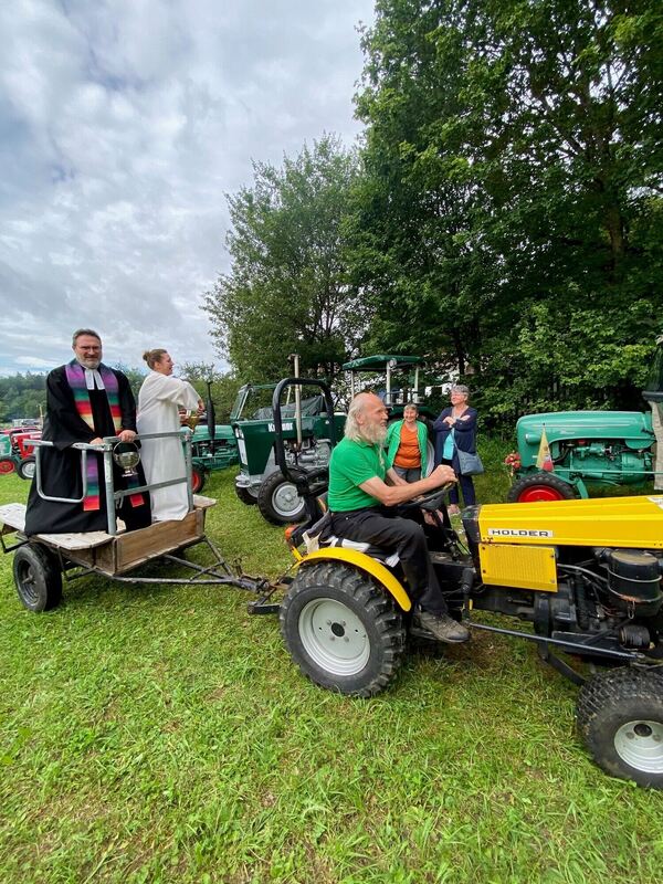 Anschließend stiegen Roßbach und Wassmer in den Anhänger von Johann Hölz’ Traktor und ließen sich segnend durch die Reihen der Traktor-Oldtimer chauffieren. (GEA)