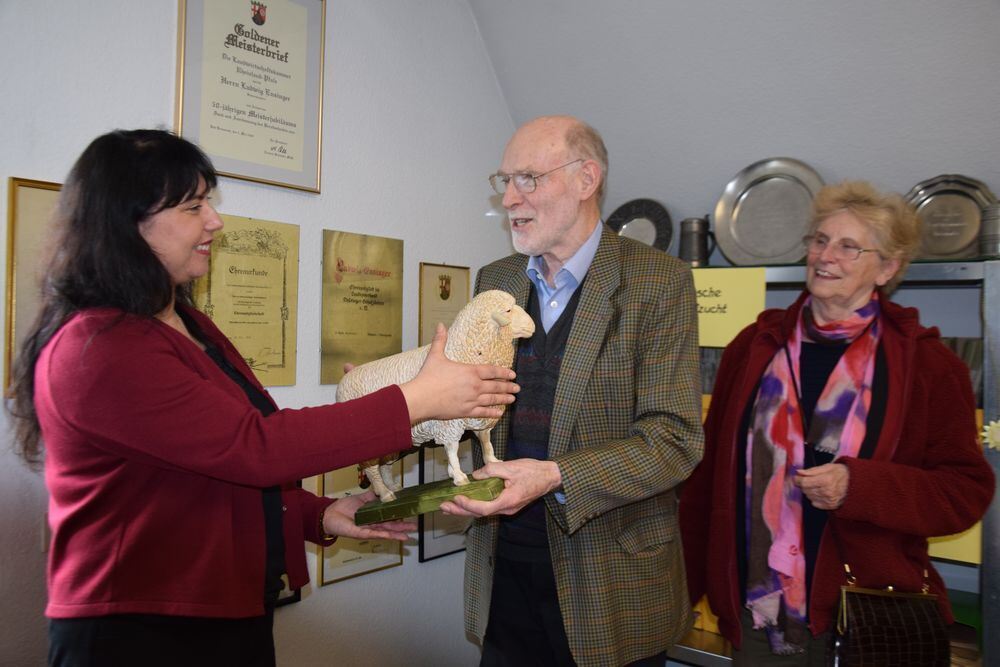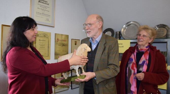 Professor Roland Ensinger überreicht mit der Schafbockfigur symbolisch den Nachlass seines Bruders Ludwig Ensinger an Dr. Patricia Leberl, die Hüterin des Archivs für Schäfereigeschichte.