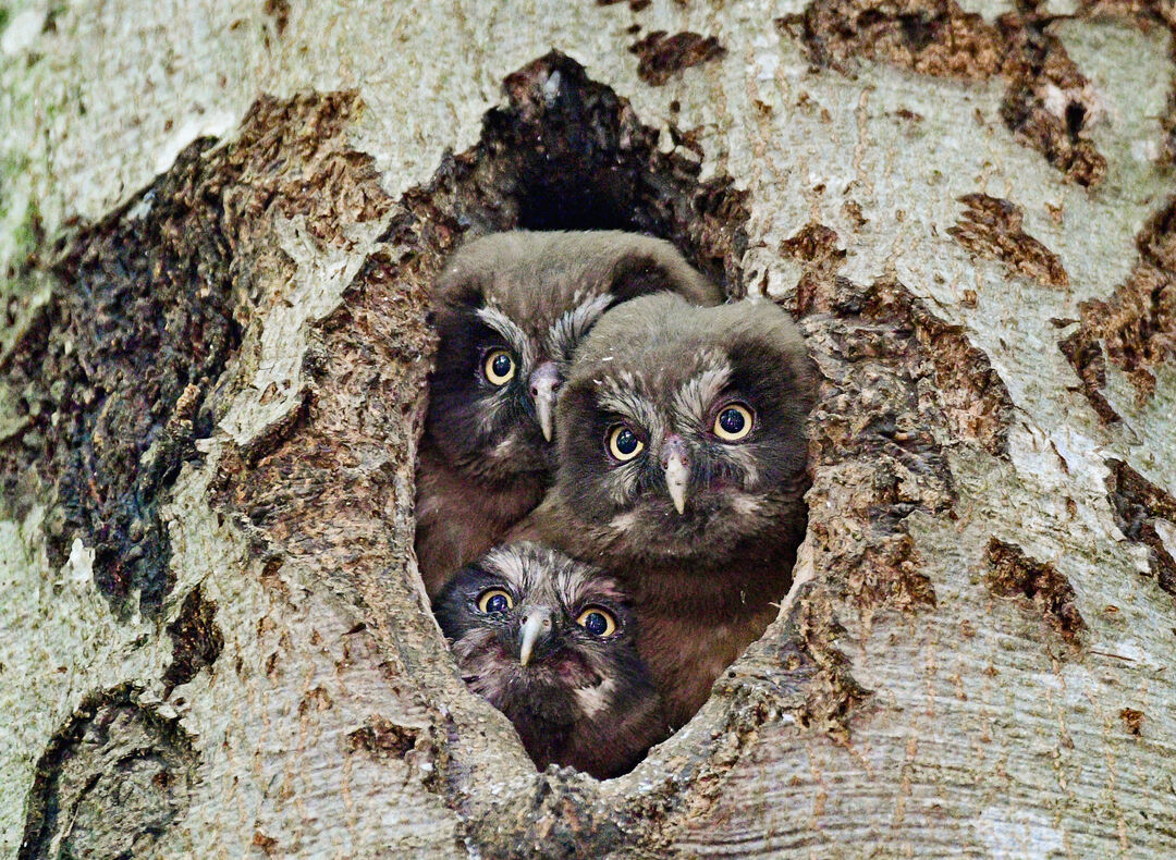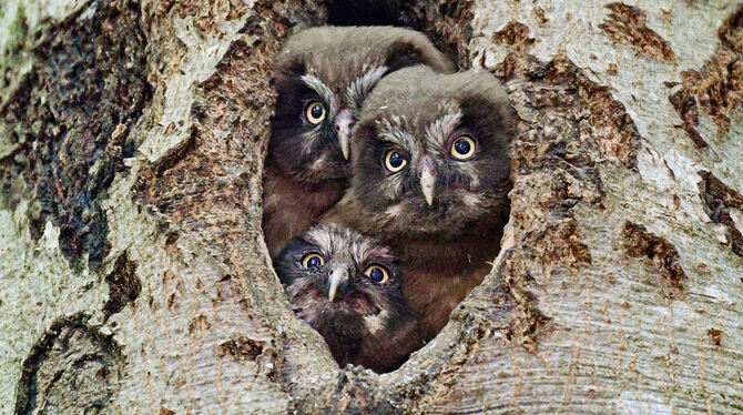 Junge Raufußkäuze in ihrer Kinderstube, einer Schwarzspecht-Höhle: Die etwa 25 Zentimeter kleinen, nachtaktiven Eulen mit dem wissenschaftlichen Namen Aegolius funereus ernähren sich vorwiegend von Nagetieren. Nachdem die tief ausgeformte Baumhöhle das Brutgeschehen rund einen Monat lang vor Beutegreifern abgeschirmt hat, drängelt sich der Eulennachwuchs nun gut sichtbar am Höhleneingang. Das heißt, die Youngster werden die von Kot und Nahrungsresten total verdreckte Höhle bald verlassen, um danach als Ästlinge noch einige Wochen von den Alttieren geführt und auch gefüttert zu werden. (em/pul)