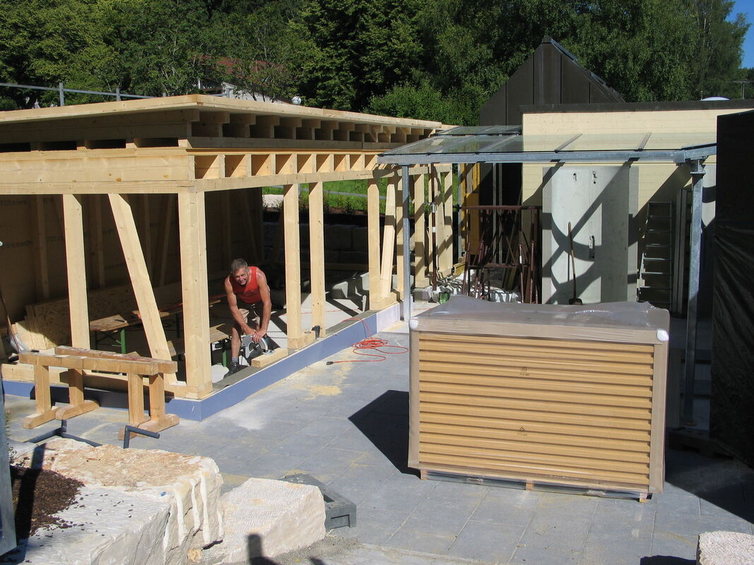 Im Außenbereich der deutlich Sauna sind die Männer derzeit daran, den Anbau in Holzständerbauweise mit leicht geneigtem Flachdach zu errichten, in dem später eine Bio-Sauna sowie eine große finnische Sauna mit automatischer Aufguss-Anlage Platz finden sollen.