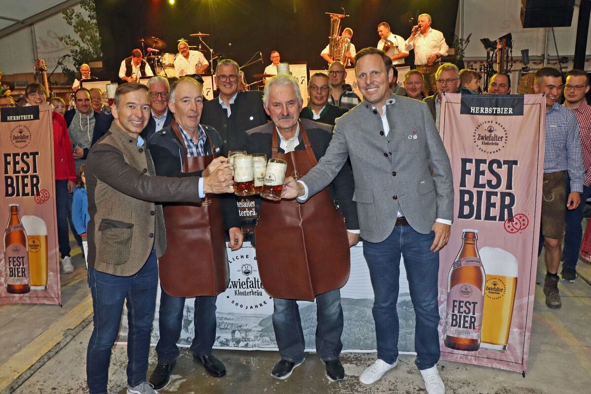 Anstoßen auf das Dapfener Schlachtfest (von links): Pascal Kober, Werner Dizinger, Michael Donth, Gebhard Aierstock und Peter Baader.