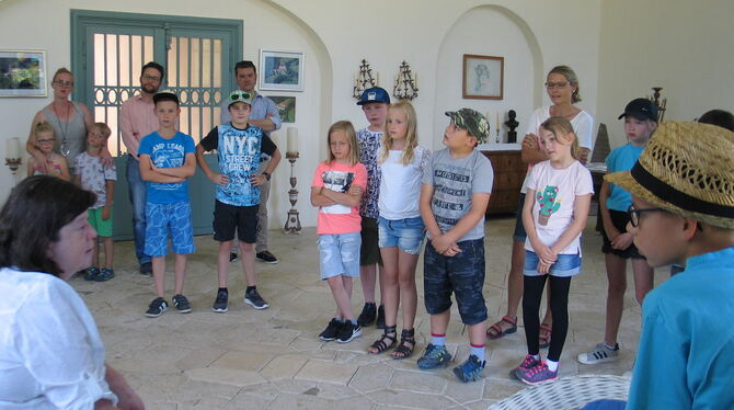 Da stehen sie noch in der Schlosskapelle und staunen stumm: Digelfeldschüler mit Lehrerin und kompletter Bürgermeister-Familie beim Empfang mit der Baronin, links.