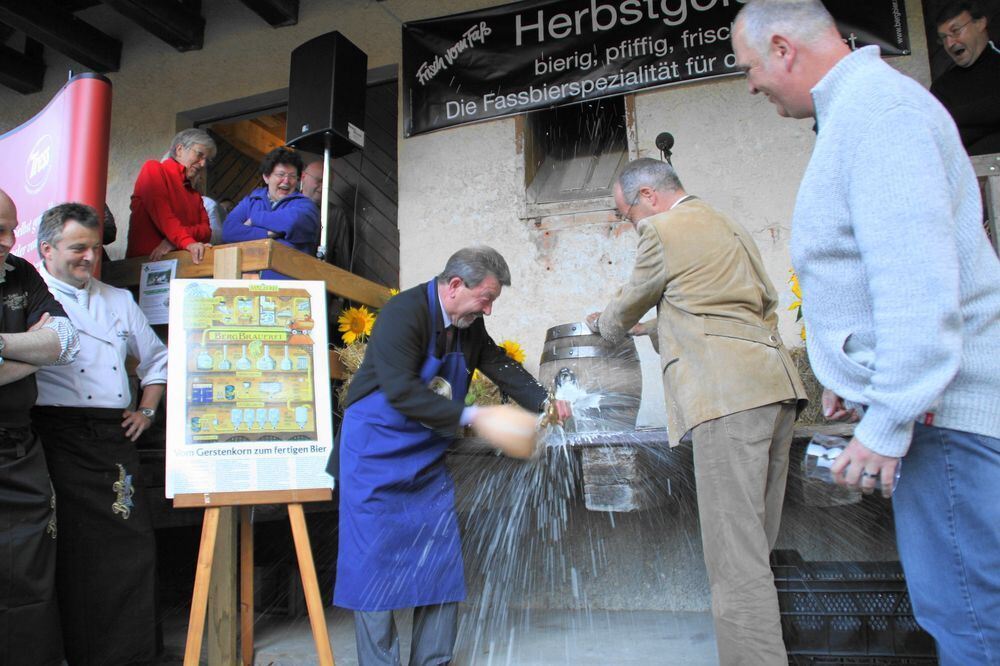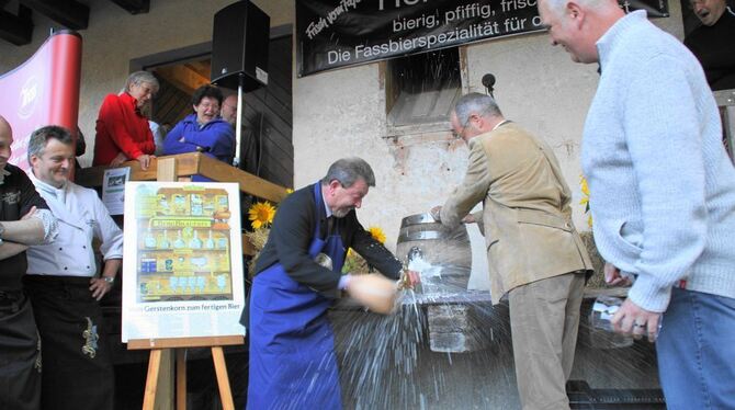 Angezapft war allerdings erst nach dem zwölften Schlag von Robert Riehle, assistiert von Uli Zimmermann. FOTO: BLOCHING