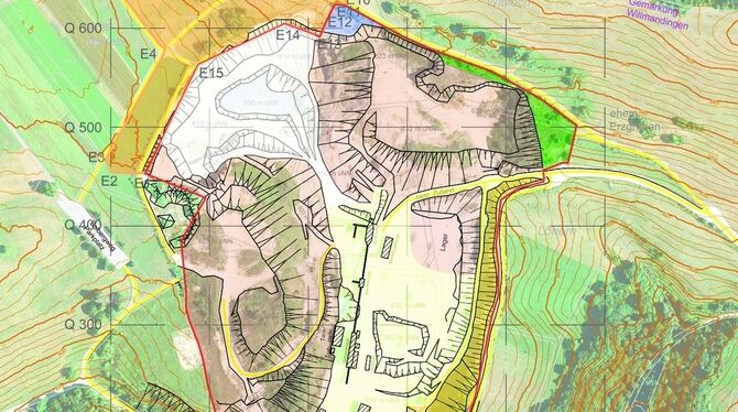 Der Willmandinger Steinbruch, schematisch dargestellt: Dunkelgrün gekennzeichnet sind Rekultivierungsareale, braun sind Flächen, die bereits wieder verfüllt werden, gelb (in der Mitte) die Betriebsfläche des Schotterwerks, weiß die bisherige Abbaufläche und orange die Erweiterungsfläche im Norden. GRAFIK: DÖRR/GEA-REPRO