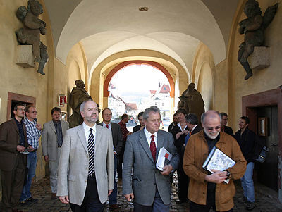 Thomas Reumann (vorn links) zu Gast in Zwiefalten: Bürgermeister Hubertus-Jörg Riedlinger (Mitte) führte den Gast durchs Peterstor zum Münster.