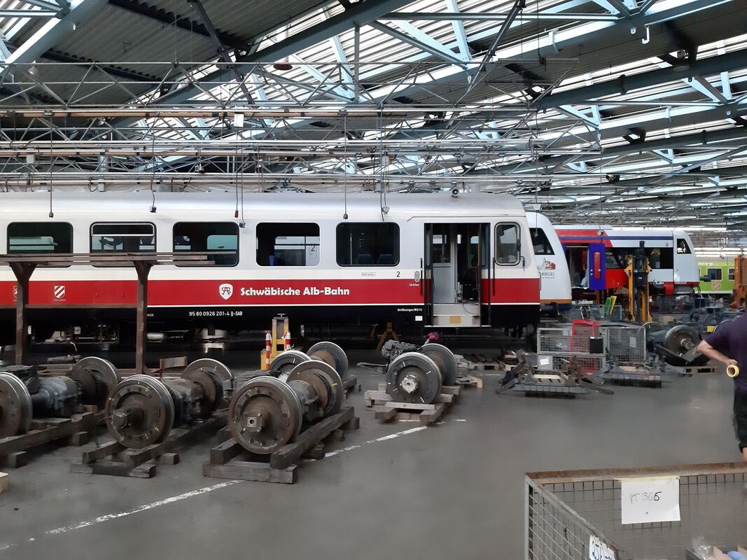 Triebwagen der Schwäbischen Alb-Bahn in der Werkstatt in Weiden: Die Fahrzeugflotte der SAB soll zum 1. Dezember komplett sein. Foto: SAB