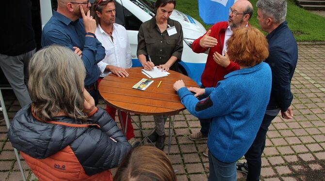 ST. JOHANN. Die Lage ist günstig: St. Johann hat das Zeug zum guten, ja sogar sehr guten Gewerbestandort. »Reutlingen und das Ermstal sind nah«, sagt Bernd Wendler vom gleichnamigen Würtinger Fensterbau-Betrieb. Und auch Michael Marschall, Vertriebs- und Marketingleiter beim Holzbauanlagen-Hersteller Weinmann in Lonsingen, schätzt die »kurze Anbindung an die Region Neckar-Alb«. Um wirklich gute Bedingungen für die örtlichen Gewerbetreibenden zu schaffen, bleibt aber auch noch manches zu tun – da waren sich die Gesprächspartner einer kleinen Talk-Runde am GEA-Mobil auf der St. Johanner Gewerbeschau einig. Hans-Dieter Nau von der Upfinger Schreinerei wünscht sich für die Betriebe schnelles Internet, für die Mitarbeiter eine gut ausgebaute Kinderbetreuung. Und Marschall hätte gerne mehr Anreize, um neue Unternehmen in der Gemeinde anzusiedeln, und verweist auf Beispiele aus dem Alb-Donau-Kreis.