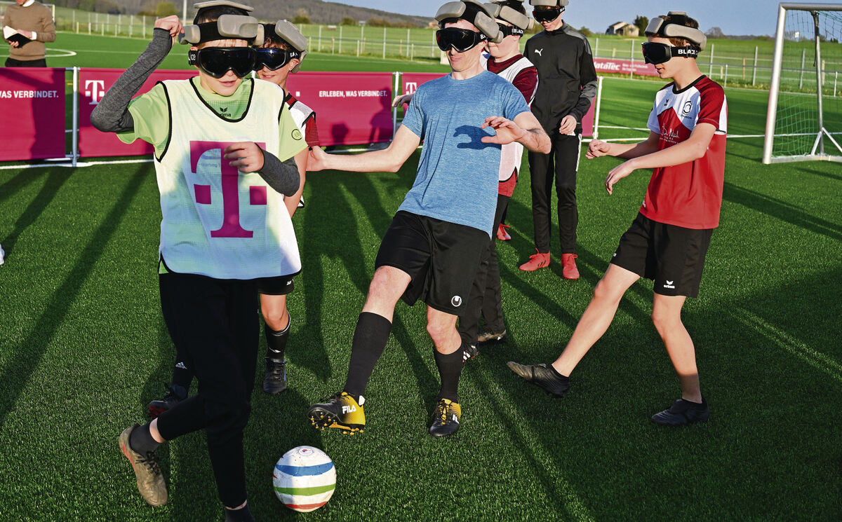 Hat keine Ahnung, wo der Ball ist: GEA-Redakteur Denis Raiser (Mitte) im Blindenfußball-Spiel mit der Sonnenbühler C-Jugend.