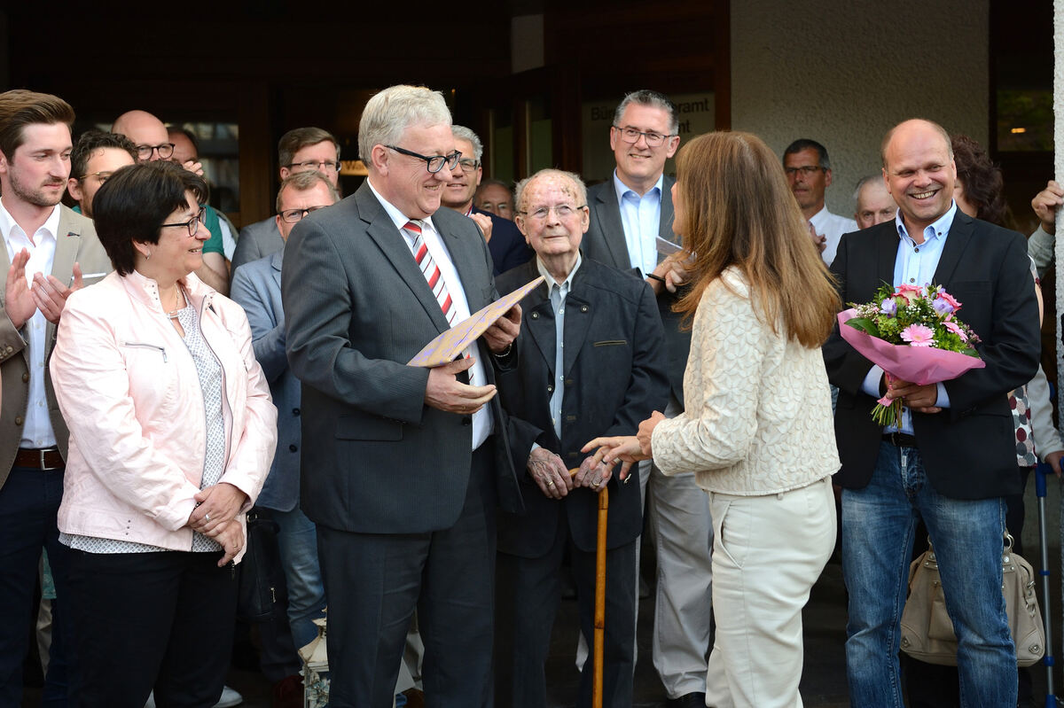 GOMADINGEN. Klemens Betz bleibt Gomadinger Bürgermeister. Was freilich spannend war, bis das Ergebnis am Sonntagabend bekanntgegeben wurde. Schlag 19 Uhr stimmten erst die Lautertalmusikanten auf dem Rathausplatz an, wo sich schon eine stattliche Menge eingefunden hatte. Erst dann nahm Bürgermeisterstellvertreter Michael Simmendinger das Mikrofon in die Hand. »Das ist jetzt der Moment, auf den Sie alle warten.« Von 1810 Wahlberechtigten haben 1 120 Gomadinger ihre Stimme abgegeben, was einer Wahlbeteiligung von 61,88 Prozent entspricht. Auf Klemens Betz entfielen 743 Stimmen, macht 67,55 Prozent, Alexandra Alth bekam 333 Stimmen, was 30,27 Prozent sind und bei Spaßkandidatin Friedhild Milller machten 7 ihr Kreuz. 17 mal seien Namen von Gomadinger Bürgern auf den Stimmzettel geschrieben worden, 20 Wahlscheine waren ungültig.
