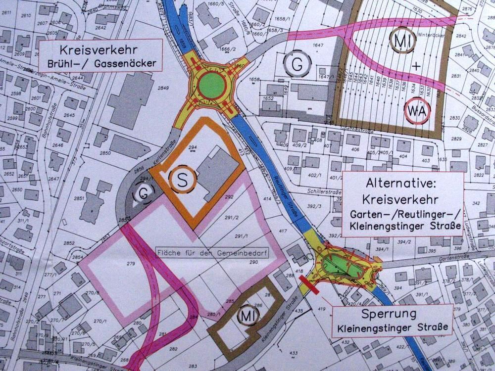 Das »Engstinger Ei« hat keine Chance, ein Kreisverkehr an der Aldi-Kreuzung dagegen schon. Hier sollen neue Verbindungsstraßen nach Großengstingen und in die Kleinengstinger Wohngebiete münden. Die neue Mehrzweckhalle ist im rosa umrandeten Bereich geplant. GEA-REPRO