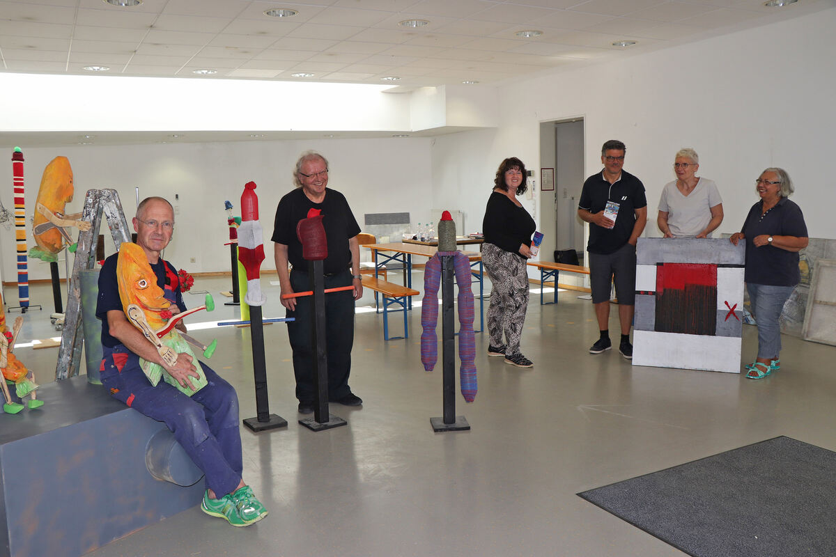 Das Interesse der Münsinger hat bereits während des Aufbaus die Kunst in der ehemaligen Postfiliale in der Uracher Straße 5 geweckt. Der schöne große, zentral gelegene Raum eignet sich hervorragend als Ausstellungsraum, unter anderem für den Münsinger Künstler Edgar Braig. Passanten sind neugierig: »Genau so ist es gedacht«, freut er sich über das große Interesse und die Möglichkeit, seine Skulpturen »Rüben essen Rosen« und »Kafkas Rudel« präsentieren zu können. »Jeder Mensch nähert sich der Kunst anders an. Mir geht es darum, zu irritieren. Das gelingt mir ganz gut«, findet Braig. Er wird zeitweise vor Ort arbeiten und aus achtlos weggeworfenen Gegenständen Montagen und Collagen kreieren. Zu sehen sind auch Bilder aus Beton und Acryl von Bedriye Caliskan und gestrickte Fantasie-Figuren von Wolfgang Rätz.