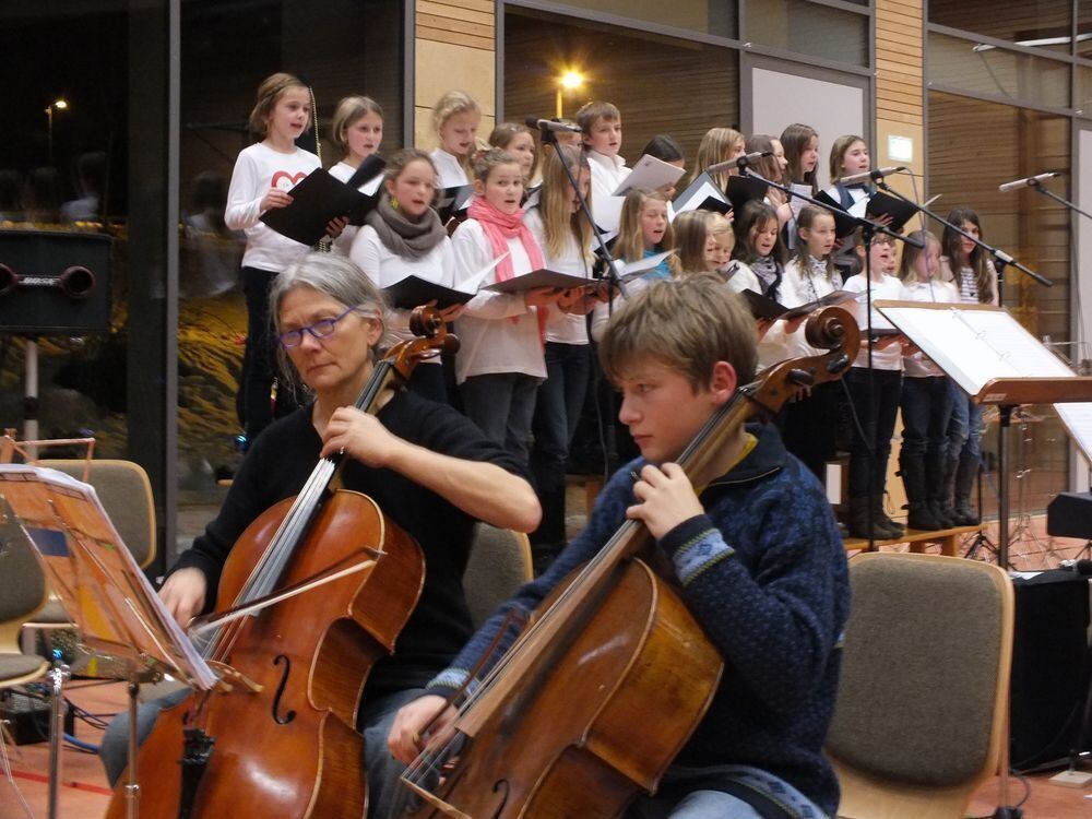 Celli und Chor beim Konzert des Münsinger Gymnasiums in der Alenberghalle. FOTO: WURSTER