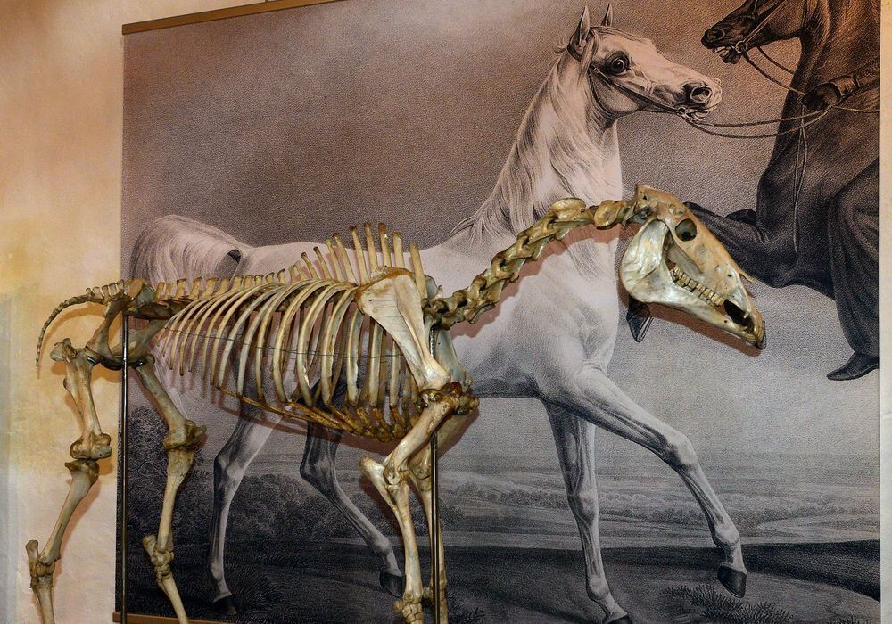 Das Skelett von Bairactar, dem Ahnherrn der Weil-Marbacher Vollblutaraberzucht, im Gestütsmuseum Offenhausen mit Gemälde von Albrecht Adam.