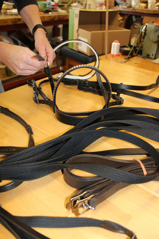 Zaumzeug, Zügel, Longen oder Steigbügelriemen fertigt Nadja Dreher laufend selbst (links), ebenso wie die stabilen Halsbänder für die Stutenherde. Auf dem Foto rechts liegt eins davon auf der zerrissenen Lederdecke des »Phantoms«.