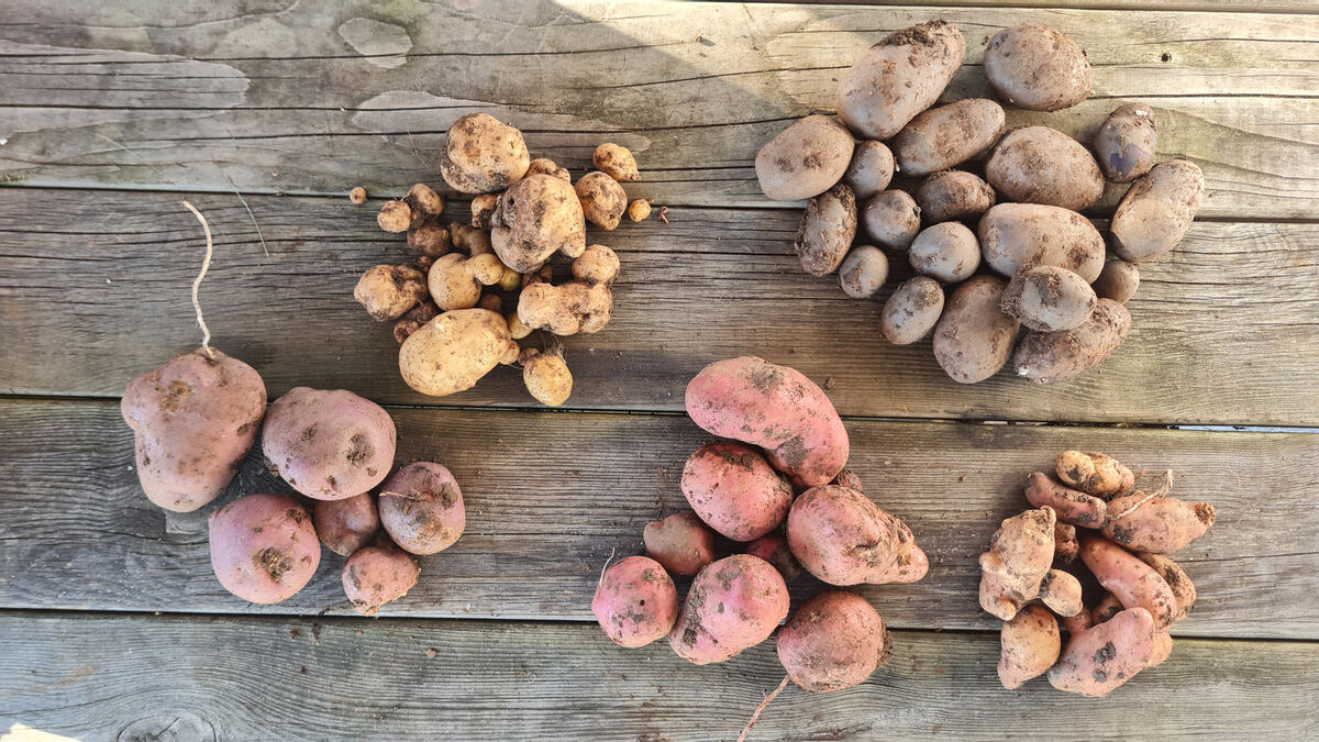Die Ernte (von links): Arran Victory, Jubel, Desirée, Blaue Anneliese (rechts oben) und Rosa Tannenzapfen (unten). FOTOS: SCHRADE