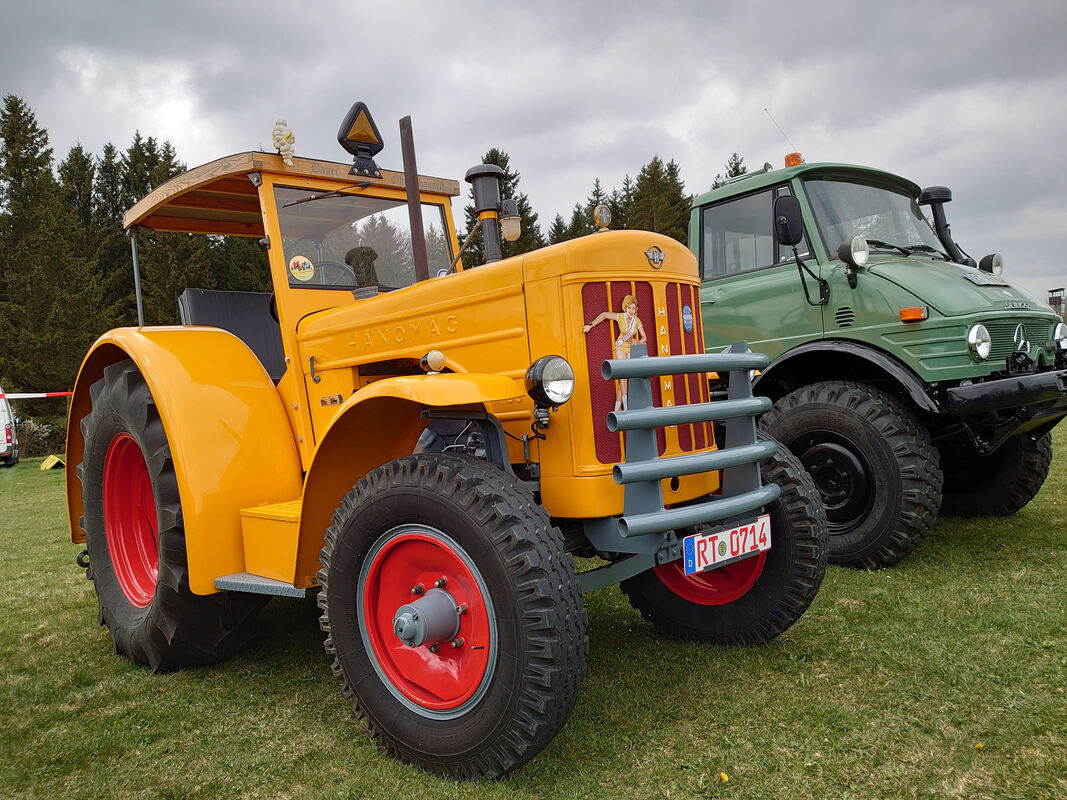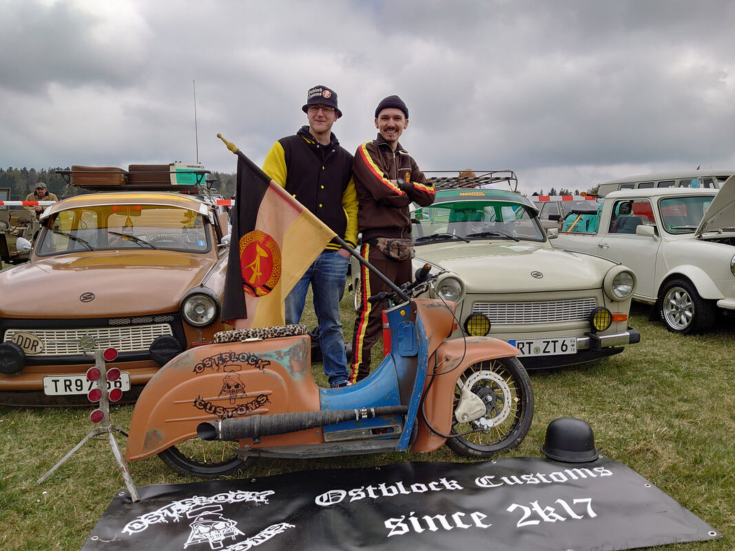 Prachtvolle Sportwagen, jede Menge Trekker, teils mit deutlichen Gebrauchsspuren, teils präsentiert wie weiland im Ausstellungsraum, chromblitzende Zweiräder und skurrile Gefährte wie die verbastelten Trabis und Schwalben des Clubs Ostblock Customs aus Römerstein. Fahren tun sie alle noch. So hat Albert Münz’ blauer Lanz am Vorabend noch den Maibaum durch Magolsheim gezogen. (wu)