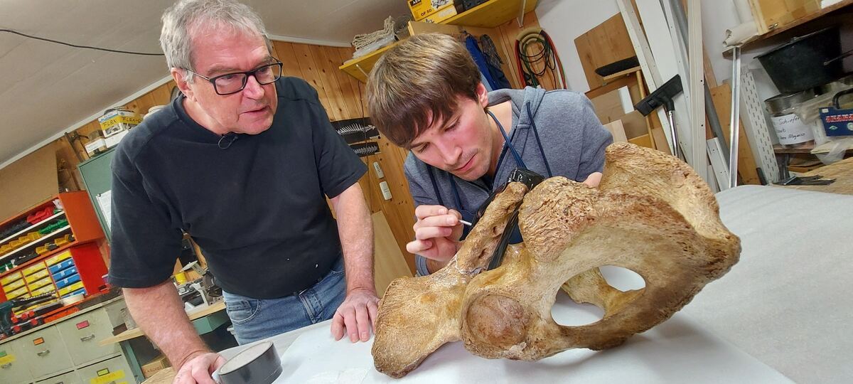 In der Werkstatt von Wolfgang und Thomas Lechner in Trostberg kommt das Skelett des Höhlenbären auf den OP-Tisch. Hier arbeiten sie am Becken. FOTOS: FISCHER