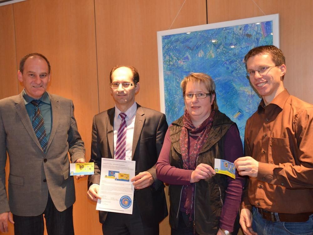 Bürgermeister Uwe Morgenstern (von links), Bernd Raach und Anita Mayer vom Handels- und Gewerbeverein Sonnenbühl sowie Kämmerer Christoph Nielser haben gemeinsam das Projekt Sonnentaler vorgestellt.