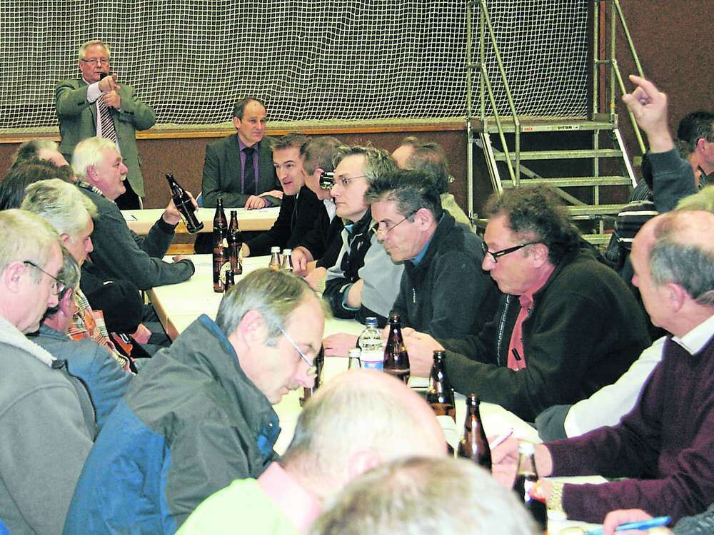 Auktionator Heinz Hammermeister (am Tisch stehend), Brunhilde Dieter von der Ortschaftsverwaltung (links) und Bürgermeister Uwe Morgenstern hatten die Interessenten bei der ersten Polter-Versteigerung in Sonnenbühl seit Langem genau im Blick.
