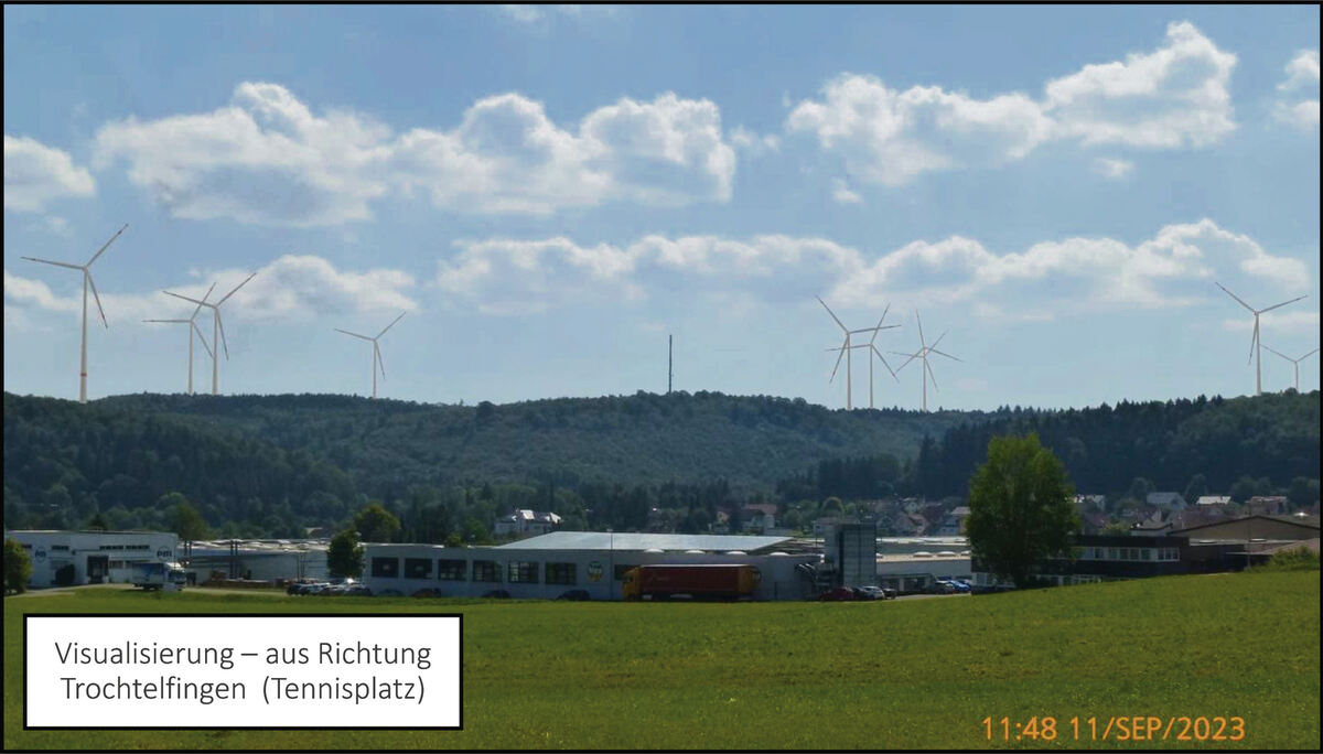 Blick auf den Windpark aus Richtung Mägerkingen. Der Ausschnitt entspricht dem menschlichen Blickwinkel, deswegen sind nicht alle zehn Windräder zu sehen.