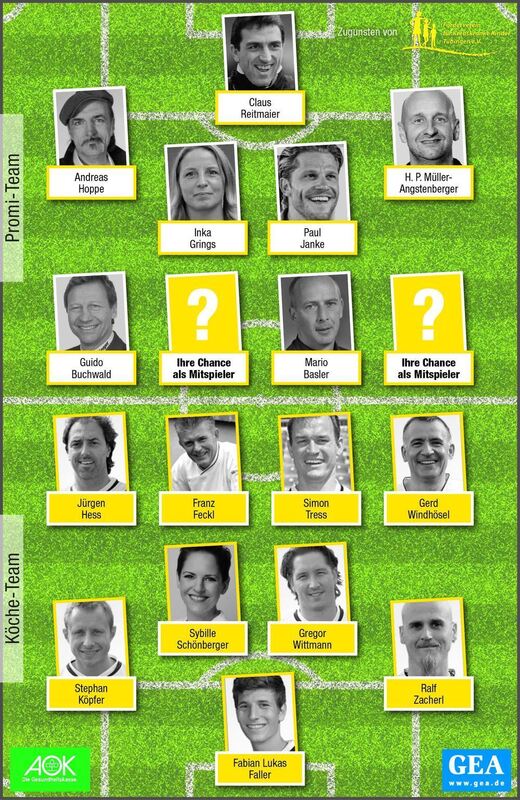 Köche gegen Promis: Am 17. Juli steigt das große Benefiz-Fußballturnier in Ehestetten. AOK und GEA verlosen zwei Plätze in der Start-Elf um Guido Buchwald. GRAFIK: MICHEL