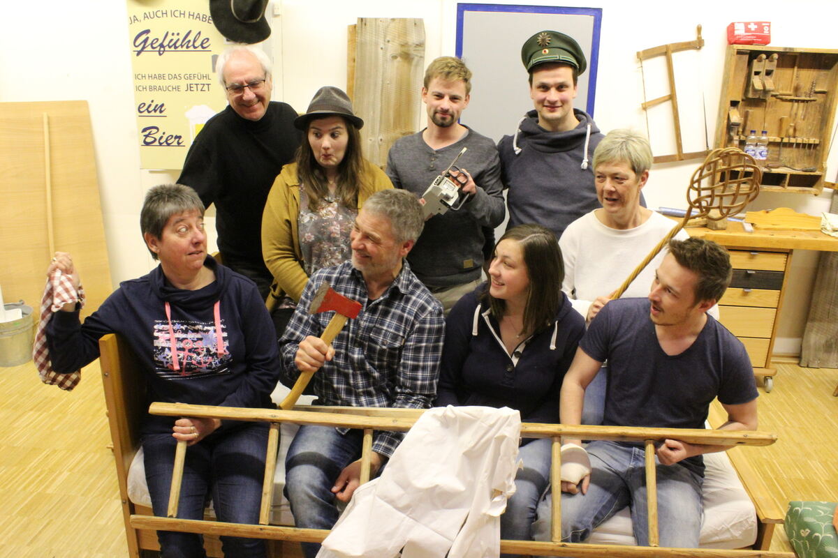 Die Theatergruppe aus Genkingen bereitet sich auf ihre Aufführungen vor. Fürs Bühnenbild haben sie echte alte Schreinerwerkstatt-Requisiten bekommen. FOTO: FISCHER