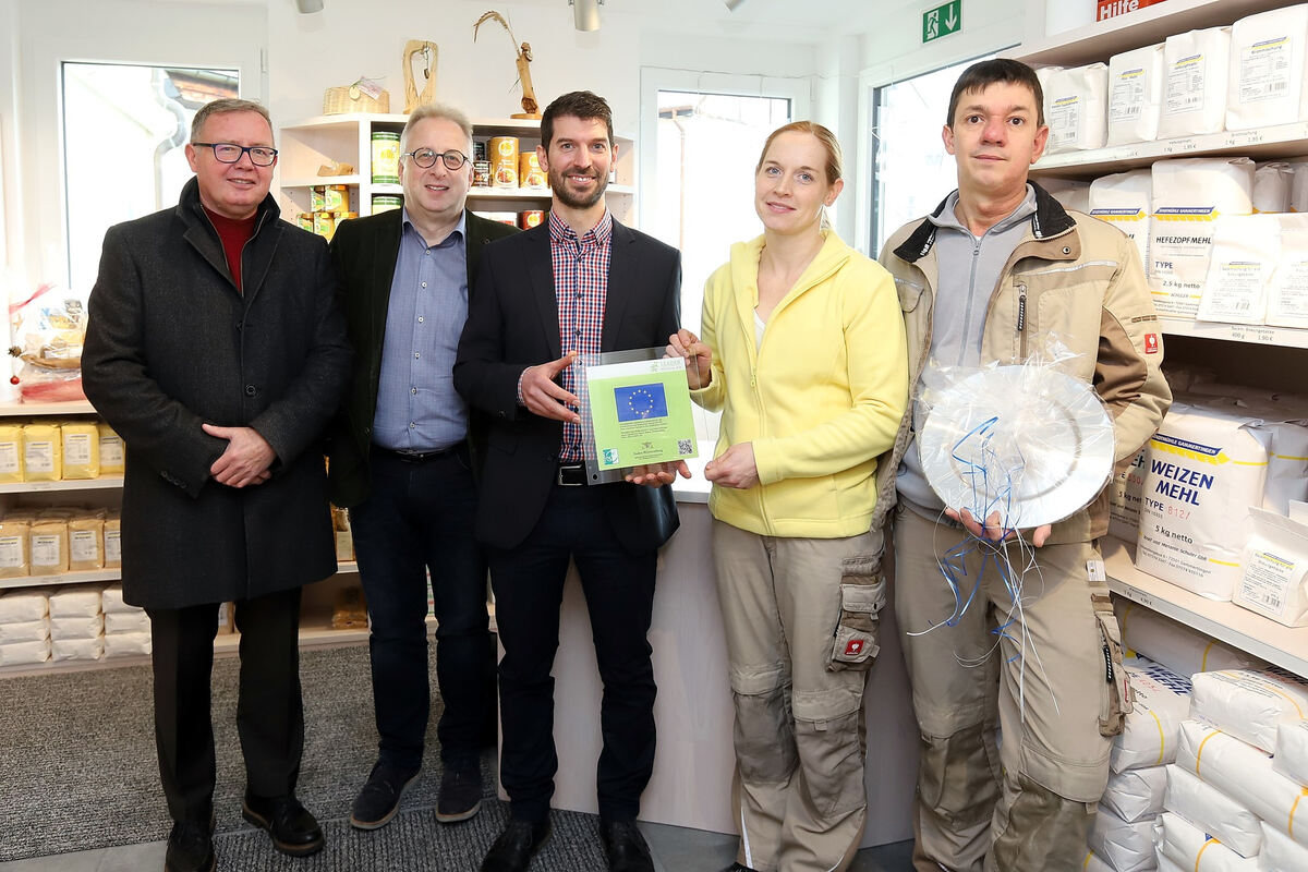 »Ein gelungenes Projekt«, da sind sich Rolf Vögtle (von links), Bürgermeister Holger Jerg, Hannes Bartholl von Leader sowie Melanie und Sven Schuler als Betreiber der Gammertinger Stadtmühle einig. FOTO: BAIER