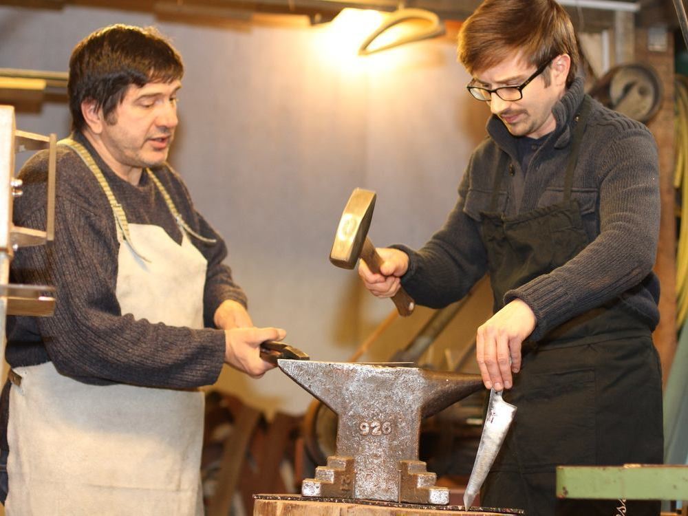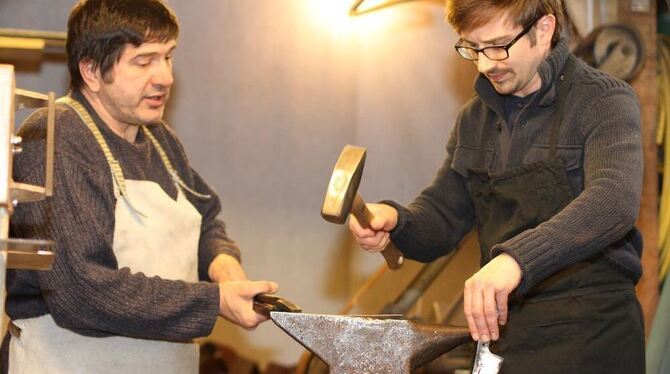 Vater und Sohn schmieden das heiße Eisen gemeinsam: Karolj (links) und Janosch Vecernjes haben in Ungarn das Handwerk des Messerschmiedens gelernt und produzieren in ihrer Bernlocher Werkstatt Messer für den Alltagsgebrauch. FOTO: LEUSCHKE
