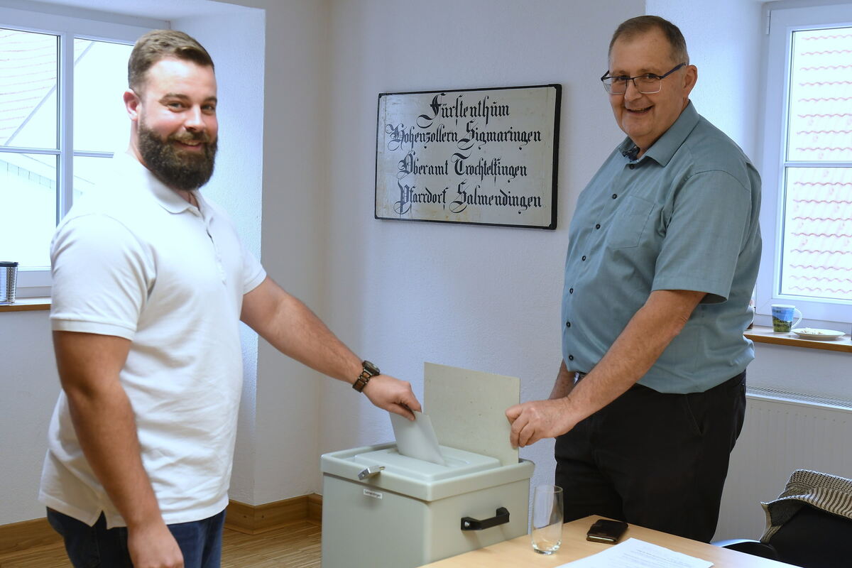 Salmendingens Ortsvorsteher Marcel Heimann (links) an der Wahlurne.