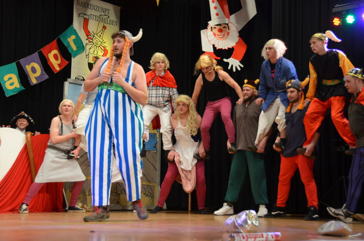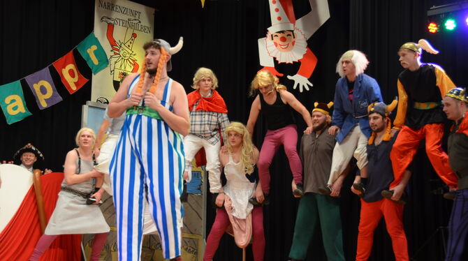Den Narren, der ein Fässle Wasser statt Bier gebracht hat, rügten Alexandra und Andreas Frank vom Wagenbau: »Wer trinkt an der Fasnet Wasser? Koi Sau!« Für 40 Jahre Wagenbau bedankten sie sich mit einem Albrebellensong, was diese wiederum rührte, blicken sie auf zwei Jahrzehnte beste Stimmungsmusik zu-rück. Nach drei Zugaben war Schluss – das begeisterte Publikum hätte beliebig weitersingen können. Charmant eskortiert von den Zunftratsdamen Elisa Jaschewski und Anna Maria Wittner, besangen die Hülasänger beispielsweise Junggärtner Karl »Süßbeck« Heinzelmann. Glaubt man dem Sprichwort um Intelligenz und Kartoffelgröße, müsse er schon »arg gscheit« sein, hatte ein unterirdischer Kostgänger nur Minikartöffelchen am Stock gelassen. Tanzend Geschichten zu erzählen können sowohl die »Saustallpfosta« als auch die Schwungrad-Crew: Erstere präsentierten Asterix und Obelix, zweitere die Persiflage vom »Schuh des Manitou«. Dass sich die Aktivgarde das Tanzen nicht verbieten lässt, glaubt man den jungen Frauen auf Anhieb – geballte Frauenpower wirbelte ebenso beeindruckend über die Bühne wie die Maskentänzer und die drei Garden samt Jubiläumsgarde. Traditionell kommt die Steinhilber Fasnet ohne Politikschelte aus – eine Mahnung platzierte Moderator und Zunftrat Martin Denzler dennoch: »Was passiert, wenn die Ampel ausfällt? Dann gilt rechts vor links und soweit darf’s nicht kommen!« (häs)