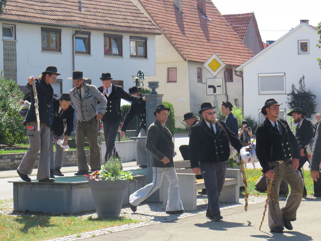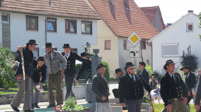 BURLADINGEN-MELCHINGEN. Ein Fuß auf der Bordsteinkante, der andere auf der Straße und lauthals singend: »Im Spinnermarsch zur Stadt hinaus, Kamerad wir bringen dich raus.« So zogen an die zwanzig Handwerksburschen – angeführt von ihrem Wortführer Jimmy Maas – durch die Melchinger Straßen, um den Steinmetzgesellen Raffael Funk aus Leinfelden auf die Walz zu verabschieden.