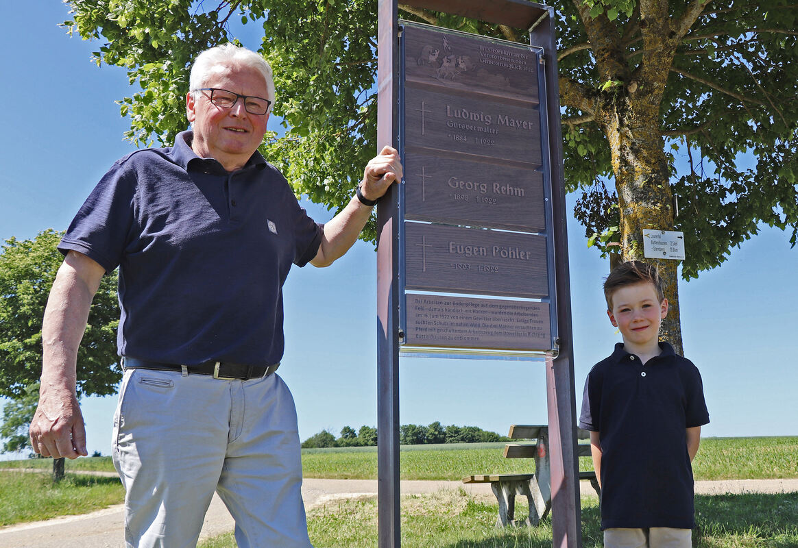 Heiner Mayer, hier mit seinem Enkel Ludwig, hat zum Andenken an seinen Großvater Ludwig und zwei weitere, vom Blitz erschlagene Männer eine Stele aufgestellt.