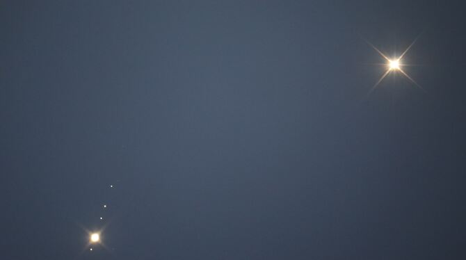 Martin Wagner hatte in Genkingen mit einem Spiegelteleskop (25 Zentimeter Durchmesser, 1 300 Millimeter Brennweite) auf einem Stativ mit Nachführung keine Probleme, die Himmelsobjekte auszumachen und abzulichten. Seit mehr als 20 Jahren fotografiert der 51-Jährige astronomische Phänomene und Flugzeuge. Schon jetzt weist er auf die nächste Besonderheit hin: Am 23. März zeigt sich zwischen Jupiter und Venus – der Mond. (ps)