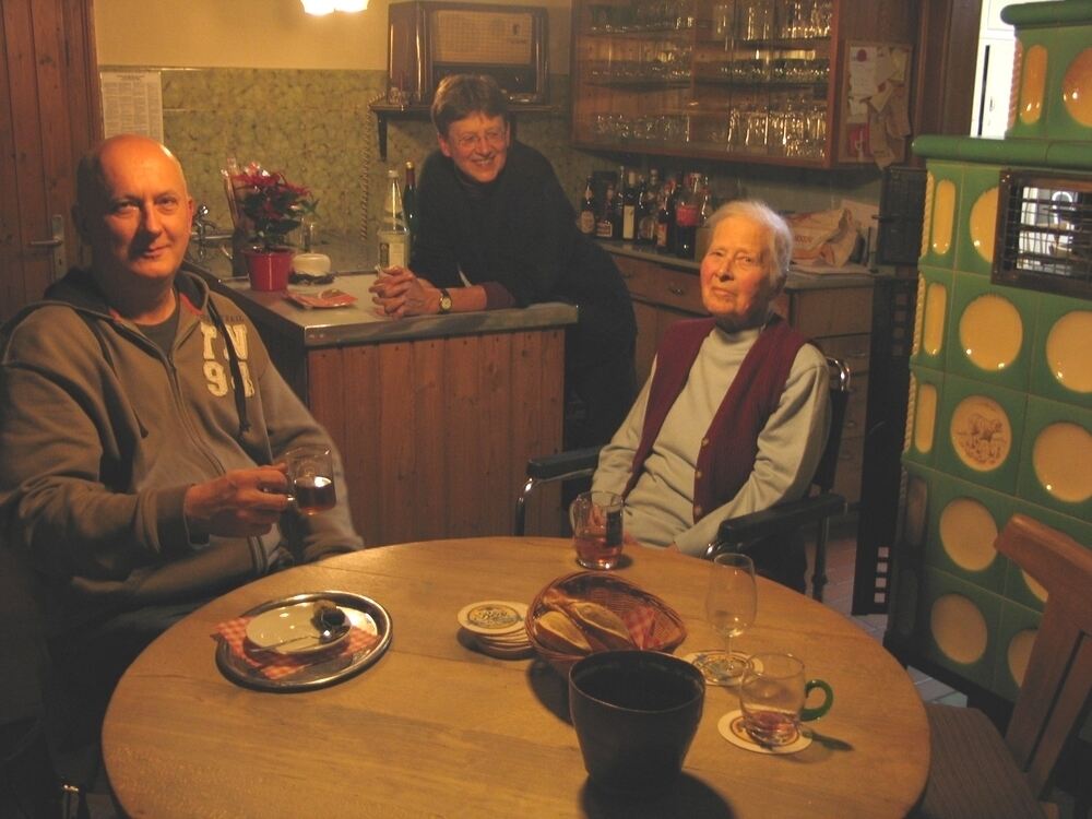 Den Rücken zum Kachelofen, sitzt die bald 85-jährige »Lamm«-Wirtin Gertrud Goller gern am Stammtisch bei ihren Gästen. Zu ihnen gehören an diesem Abend Sohn Thomas und Tochter Frido, die den Ausschank übernimmt. GEA-FOTO: OELKUCH