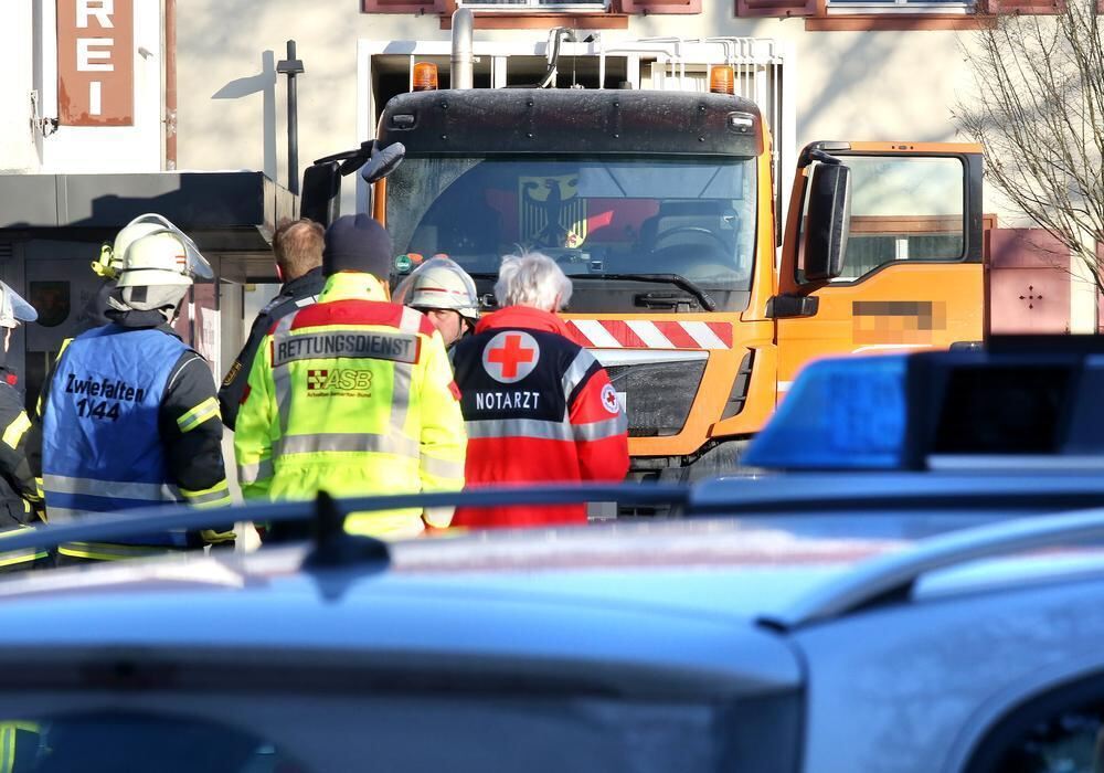 Einsatzkräfte von Rettungsdienst, Feuerwehr und Polizei stehen an einer Unfallstelle in Zwiefalten. Das Fahrzeug eines Müllentsorgungsbetriebs hat dort aus noch nicht geklärter Ursache eine Fußgängerin erfasst und dabei tödlich verletzt.