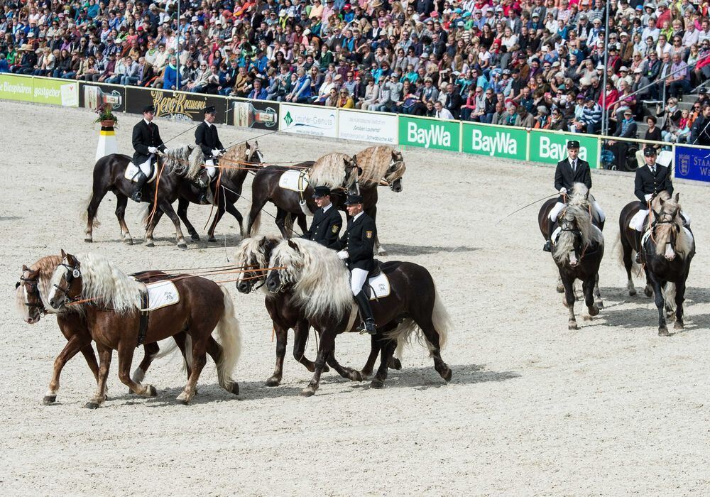 Die »Fahrschule im Sattel«wird im Haupt- und Landgestüt in Marbach während des Auftaktes der Hengstparaden 2015 mit Pferden der Rasse Schwarzwälder Kaltblut präsentiert.