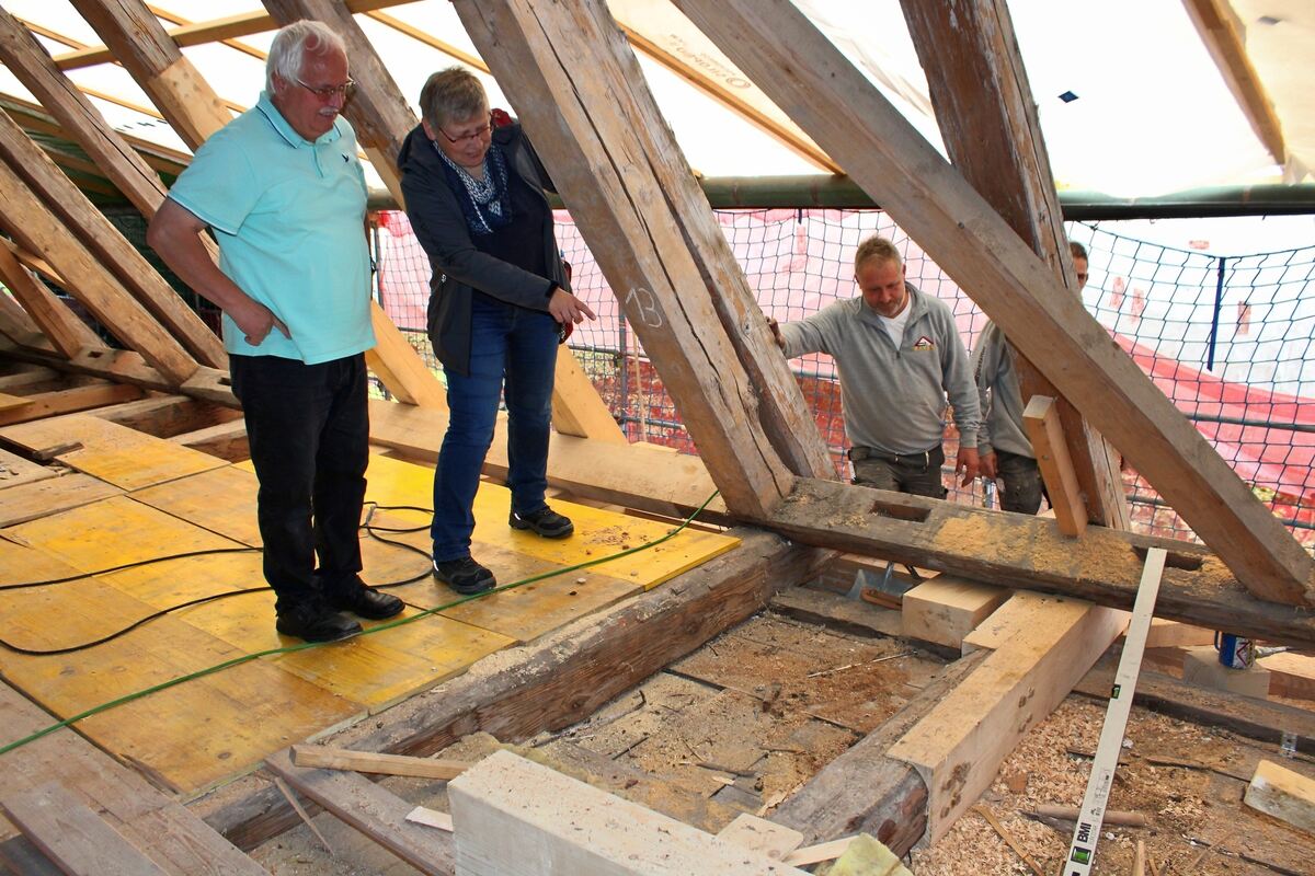 Diakon Rudolf Tress (links) und Architektin Stefanie Mayer besehen die neuen Balken, die die Zimmerei Böhler eingefügt hat