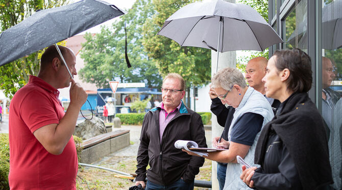 Kritiker des Gemeinderatsbeschlusses zur Abschaffung der unechten Teilortswahl (von links): Gemeinderat Wolfgang Schmid, Ortschaftsrat Rolf Geckeler und Oliver Heinz mit den GEA-Redakteurinnen Julie-Sabine Geiger und Christine Dewald. FOTOS: NIETHAMMER/LEUSCHKE
