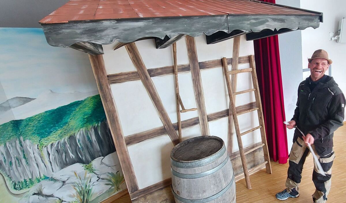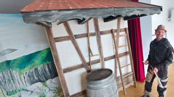 Matthias Herrmann hat für alles eine Lösung: Auch ein Vordach hat er für die Kulisse der Genkinger Sportskomede gezimmert.