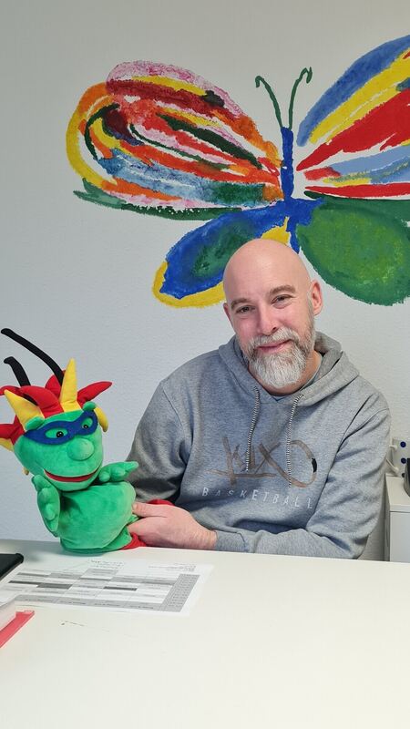 Thomas Kern ist Schulsozialarbeiter an der Grund- und Werkrealschule in Würtingen, Handpuppe Lubo hilft ihm bei seiner Arbeit.