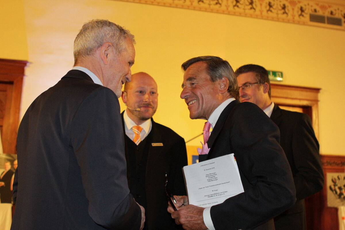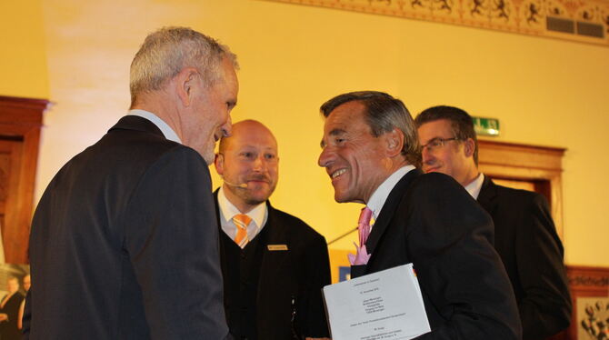 Unternehmer im Gespräch: Trigema-Chef Wolfgang Grupp (vorne rechts) und Albgut-Eigentümer Franz Tress (links) mit den Volksbank-Vorstandsmitgliedern Christian Bückle (Mitte) und Andreas Deiß. FOTO: SCHRADE