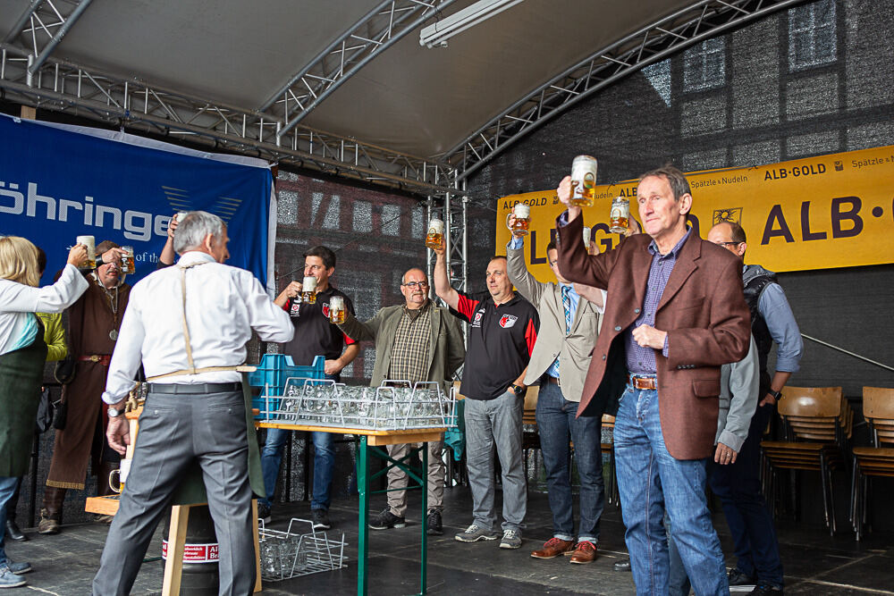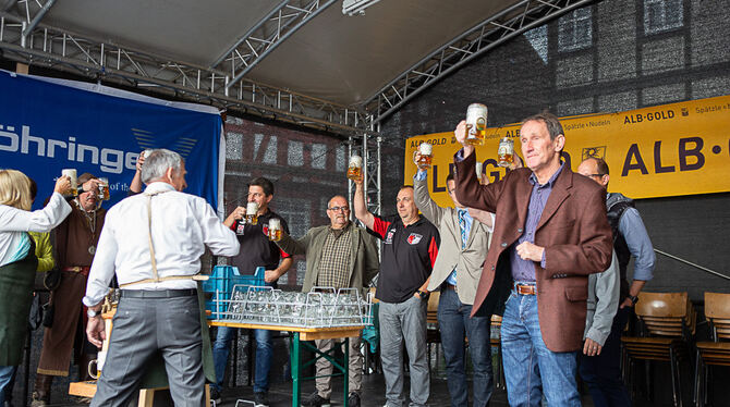 TROCHTELFINGEN. Der Auftakt ist geglückt – wettertechnisch und organisatorisch. Viele Trochtelfinger kamen am Freitag zum Fassanstich auf den Rathausplatz. Doch bevor es mit dem Holzhammer zur Sache ging, brachten die vier teilnehmenden Musikkapellen beim Sternmarsch schon mal alle in Feierlaune. Punkt 19 Uhr ertönte traditionell der Startschuss aus dem Brannerstutzen der Bürgerwehr, kurz darauf der Musikverein Mägerkingen, gefolgt vom Musikverein Wilsingen, der Stadtkapelle Trochtelfingen und dem Fanfarenzug.
